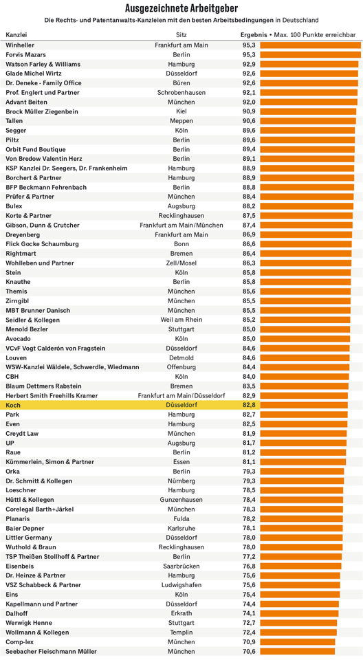 Die Auswertung umfasst die fünf Bereiche „Arbeitsumfeld/Digitalisierung“, „Karriereförderung“, „Remote Work“, „Familienfreundlichkeit“ und „Unternehmens-/Führungskultur“. Ausgezeichnet werden Kanzleien, die mindestens 70 Punkte erreicht haben. Dies gelang 65 der mehr als 300 teilnehmenden Kanzleien.